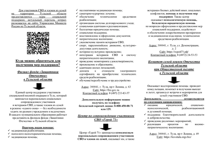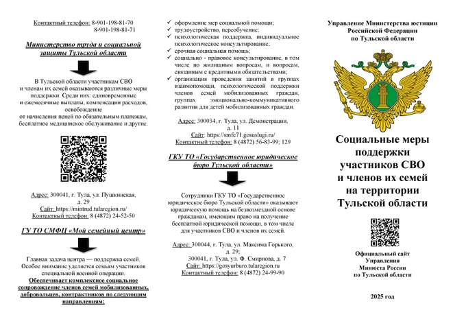 Меры социальной поддержки, предоставляемые военнослужащим, участвующим в специальной военной операции, и членам их семей размещены на сайте Управления Министерства юстиции Российской Федерации по Тульской области